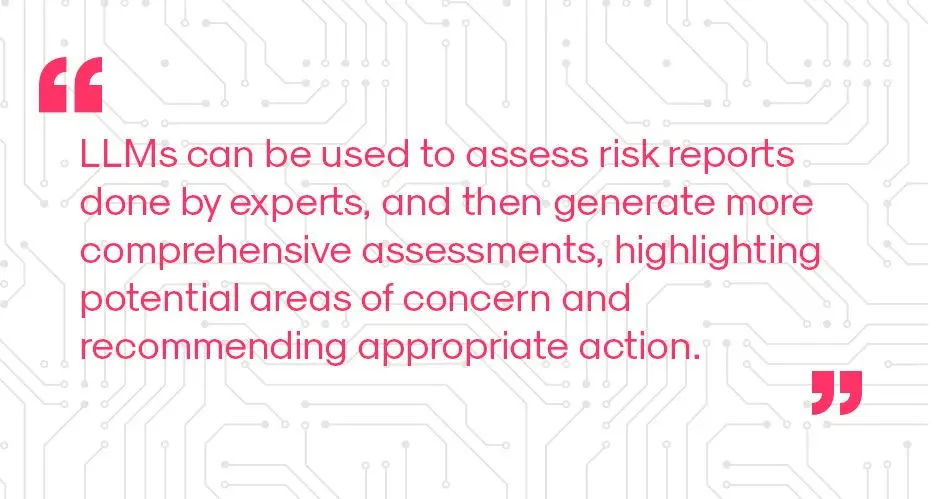 For example, I’ve seen implementations that make use of rule-based NLP to analyse engineering risk reports and help risk engineers in scoring risks. This classic approach is of considerable help, but has high costs of development and maintenance. RAG can be used to make this process smoother, since better information can be found. LLMs can be used to assess risk reports done by experts, and then generate more comprehensive assessments, highlighting potential areas of concern and recommending appropriate action.